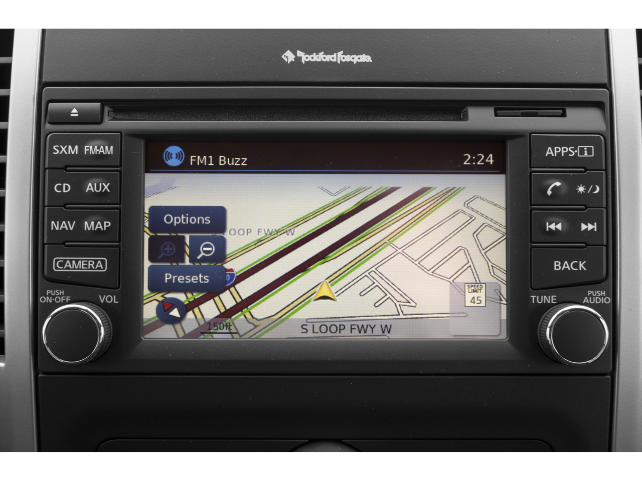 - Radio: Rockford Fosgate Premium Audio System -inc: AM/FM/CD/AUX, USB connection port, Bluetooth® hands-free phone system, streaming audio via Bluetooth®, Siri Eyes Free, steering wheel audio controls, 8 speakers w/1 subwoofer unit (2 speakers), NissanConnect w/navigation and mobile apps, Nissan Navigation System w/voice guidance, 5.8" color touch-screen display, Nissan voice recognition for navigation and audio, SiriusXM Traffic, SiriusXM Travel Link (fuel prices, weather, movie listings, stock info and sports) and SiriusXM satellite radio